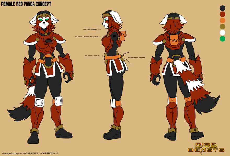 This character study of the Red Panda was made as part of the promotionals for the ROTB Kickstarter for series 2 by Jon Karis, showing the red panda concept in turnaround action figure format (for a potential series 3 or 4), ...some added correct colors for splash (like in the tail) and she looks ready for action!!